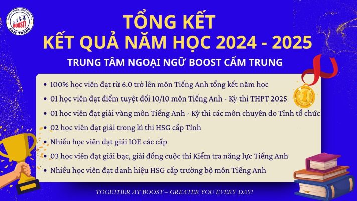 Năm học 2024–2025 khép lại bằng những con số ấn tượng và thành tích nổi bật từ các học viên đang theo học tại Trung tâm Ngoại ngữ Boost Cẩm Trung. Đó không chỉ là kết quả của sự cố gắng bền bỉ từ phía học sinh mà còn là minh chứng cho chất lượng giảng dạy và môi trường học tập hiện đại, sáng tạo tại Boost.